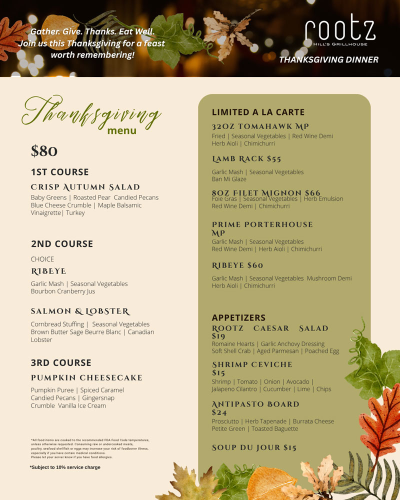 Thanksgiving Dinner - November 27, 2025 For Dinner 6:00 p.m. - 9:30 p.m. *Subject to 10% service charge *Consuming raw or undercooked meats, poultry, seafood, shellfish or eggs may increase your risk of foodborne illness. Please let your server know if you have food allergies.